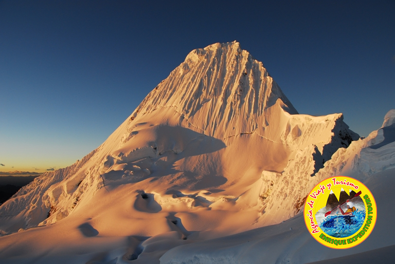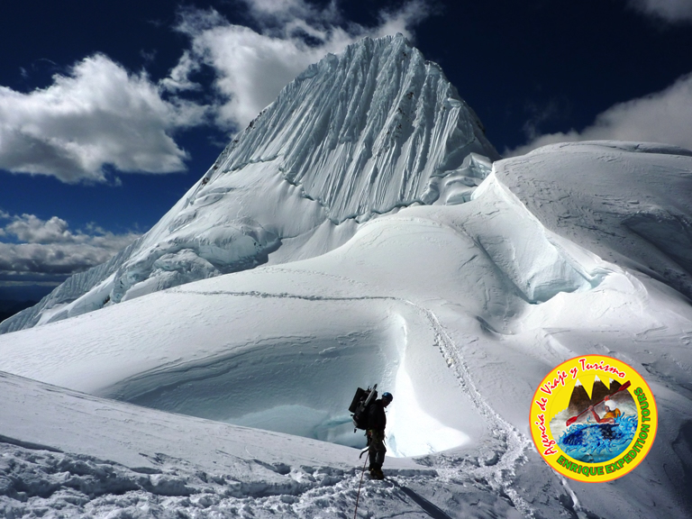 This day, starting from Camp 1, we will descend with our clients to the base of the wall. There we will reach up until the lower part of the Rimaya. In this part we will climbing a zone in great uniform slope of about 55º - 60º and we will reach a steeper part with more than 85° and 90° at a height of 4 meters. Continuing the original channel (65º - 75º), we will meet some small mixed sections until reaching the summit – after, we will return to the Alpamayo base camp.