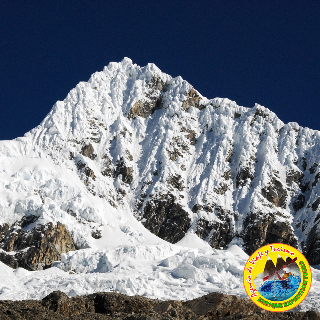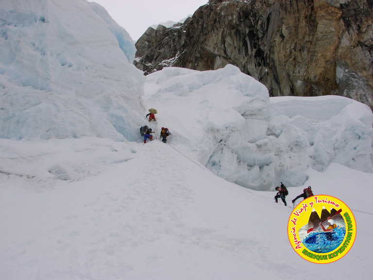 This day, starting from Camp 1, we will descend with our clients to the base of the wall. There we will reach up until the lower part of the Rimaya. In this part we will climbing a zone in great uniform slope of about 55º - 60º and we will reach a steeper part with more than 85° and 90° at a height of 4 meters. Continuing the original channel (65º - 75º), we will meet some small mixed sections until reaching the summit – after, we will return to the Alpamayo base camp.