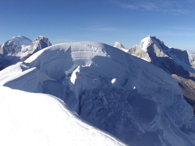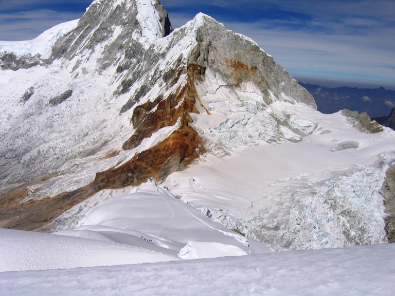 Saldemos del campamento a las 1:00 am siguiendo a nuestro guía, iniciaremos la escalada pasando por una zona de hielo hueco o mixto y ascender la uniforme pendiente por el centro. En la ruta de ascensión SE la pendiente se inclina a 3 largos de la Cumbre el cual será superado por la derecha, tras varias horas de escalada estaremos llegando a la cumbre - cumbre sentiremos una sensación increíble y tendremos una vista de los nevado Alpamayo,Huandoy, Huascarán, Pirámide, Pisco…...Luego el retorno emprenderemos unas largas líneas de rápeles sobre estacas fijas para luego estar llegando Campo alto – Morrena.