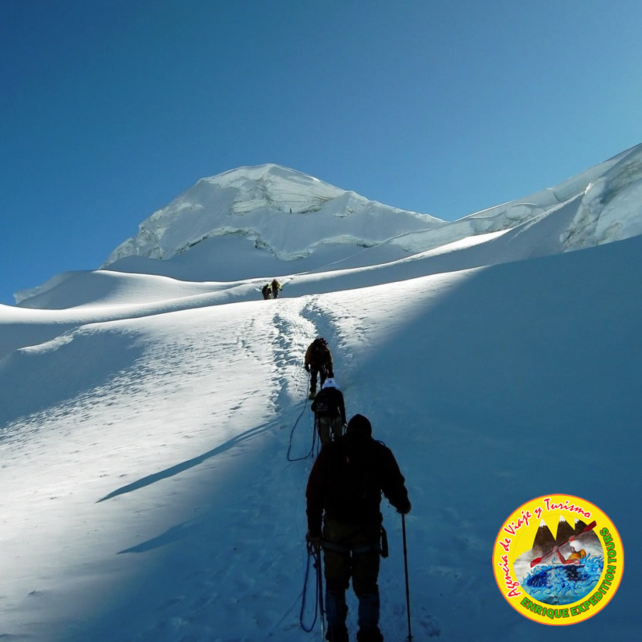 Saldemos del campamento a las 1:00 am siguiendo a nuestro guía, iniciaremos la escalada pasando por una zona de hielo hueco o mixto y ascender la uniforme pendiente por el centro. En la ruta de ascensión SE la pendiente se inclina a 3 largos de la Cumbre el cual será superado por la derecha, tras varias horas de escalada estaremos llegando a la cumbre - cumbre sentiremos una sensación increíble y tendremos una vista de los nevado Alpamayo,Huandoy, Huascarán, Pirámide, Pisco…...Luego el retorno emprenderemos unas largas líneas de rápeles sobre estacas fijas para luego estar llegando Campo alto – Morrena.