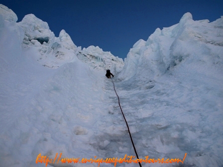 Este día desde el Campo 1 descenderemos con nuestros clientes hasta la base de la pared, posteriormente ascendemos hasta alcanzar la parte más baja de la rimaya, en esta parte se avanza por una zona en gran pendiente uniforme de unos 55º - 60º y lleguemos a una parte más pendiente de 85º y de 90º en una altura de 4 metros, continuando por la canaleta original (65º - 75º) encontremos algunos pequeños tramos mixtos hasta llegar a la Cumbre cimera – estaremos retornando al Col del Alpamayo – Cb Campamento.