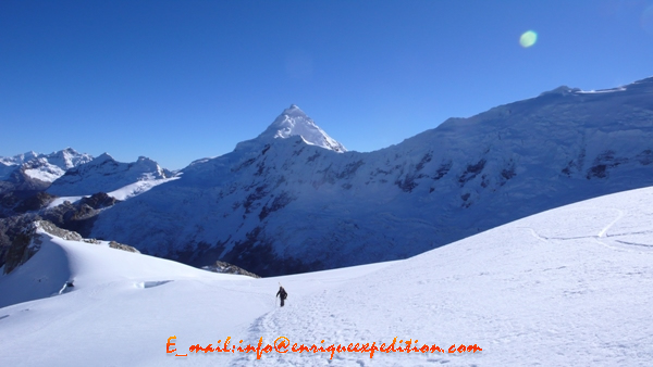 Este día atacamos muy temprano (3 – 4 a.m.) asía la cumbre de Tocllaraju (6.034m.). Atravesamos y ascendemos el glacial N hacia el collado con el aquilpo S. y escalaremos la arista NO que presenta pendientes de 55 a 60º que tiene una rimaya en su parte baja y otro más difícil cerca del hongo Cimero. Atravesaremos la rimaya y escalaremos el hongo directamente a la Cumbre. Y retornamos al campo base de Ishinca (horas aprox.12 horas).