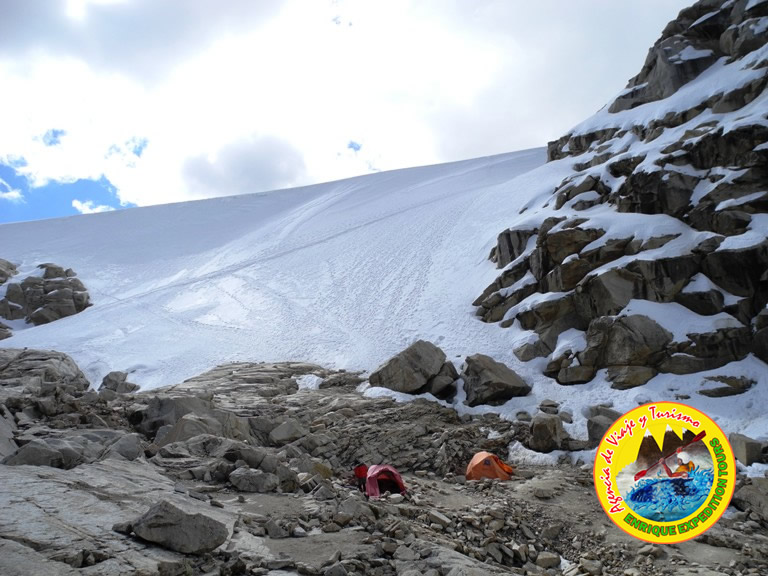 Este día nuestros porteadores se encargaron en trasportar nuestros equipo técnico de escalada, Alimento y campamento y salimos para comenzar a ascender la morrena, en el trayecto nos encontremos con lugares muy rocoso y estas trochas acompañadas de pulidas rocas granito y tras superarlos lleguemos a ingresar al glacial, ingresemos por la fácil rampas, después de bordear algunas grietas nos situemos debajo de la ya conocido collado, y comenzar a escalar poco a poco hasta llegar a las pendientes finales ( 60º - 65º) y superemos este collado para estar descendiendo unos metros mas y ubicarnos en el C1 del Alpamayo. (Campamento 1 - 5300 m.s.n.m).