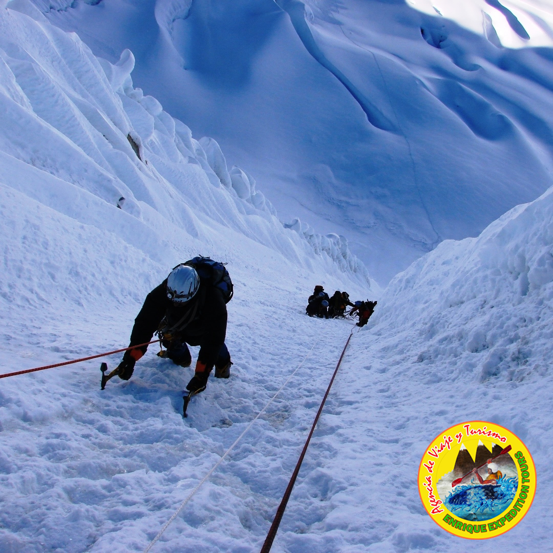 This day, starting from Camp 1, we will descend with our clients to the base of the wall. There we will reach up until the lower part of the Rimaya. In this part we will climbing a zone in great uniform slope of about 55º - 60º and we will reach a steeper part with more than 85° and 90° at a height of 4 meters. Continuing the original channel (65º - 75º), we will meet some small mixed sections until reaching the summit – after, we will return to the Alpamayo base camp.