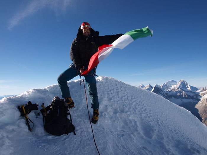 This day, starting from Camp 1, we will descend with our clients to the base of the wall. There we will reach up until the lower part of the Rimaya. In this part we will climbing a zone in great uniform slope of about 55º - 60º and we will reach a steeper part with more than 85° and 90° at a height of 4 meters. Continuing the original channel (65º - 75º), we will meet some small mixed sections until reaching the summit – after, we will return to the Alpamayo base camp.
