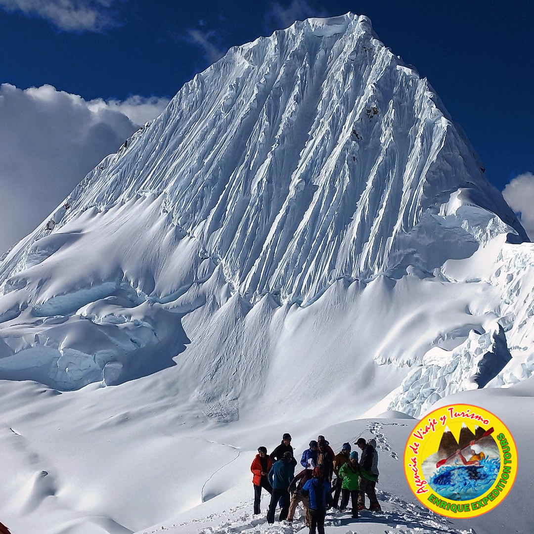 This day, starting from Camp 1, we will descend with our clients to the base of the wall. There we will reach up until the lower part of the Rimaya. In this part we will climbing a zone in great uniform slope of about 55º - 60º and we will reach a steeper part with more than 85° and 90° at a height of 4 meters. Continuing the original channel (65º - 75º), we will meet some small mixed sections until reaching the summit – after, we will return to the Alpamayo base camp.