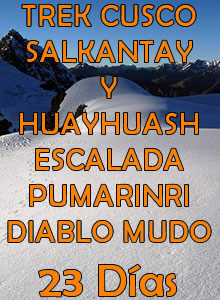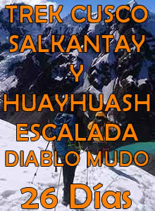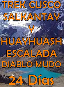 | TREKKING CUSCO SALKANTAY MACHUPICCHU CORDILLERA HUAYHUASH PERU, operadores especializados en la organización de Trekking Cusco Salkantay Machupicchu Cordillera Huayhuash Peru, contamos con un equipo de profesionales de experiencia laboral en el campo de Turismo de Alta Montaña, cuyo objetivo principal es brindar calidad, seguridad y garantía en todos nuestros servicios, de esa manera, cumplir con las expectativas y exigencias del Cliente. Nosotros le ayudaremos a organizar su programa Tours en bus, Tours Convencional, Trekking, Climbing, Caminatas, Escalada en Hielo en la Cordillera Blanca y Huayhuash como también en Cusco – Arequipa – Puno - Perú. |