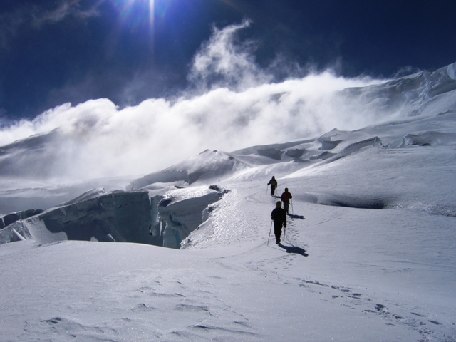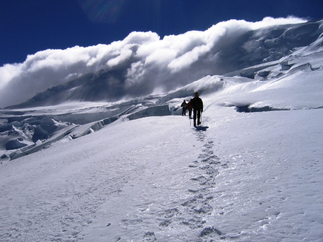Salimos muy temprano del Cb, subimos una morrena encima de la laguna Lejiacocha y nos dirigimos hacia el C1 (5200) para llegar al C1 hay que pasar una zona pedregosa de unos 400 metros encima de la cual está el C1, en esta parte el equipaje lo llevaremos con porteadores ya que el acceso de mulas es imposible y si hay nieve en esta parte utilizar grampones y piolet en esta zona nos dirigiremos más a la parte izquierda posible y también es conveniente pasar muy temprano ya que caen muchas piedras, por lo tanto le proporcionaremos cascos, la pendiente de hasta 50 -55º. Si es un año seco la nieve empieza a mitad del corredor donde se entra al glacial. Desde este punto al C1 ir Subiendo una interminable cuesta de 40 – 45º porteando nuestras equipaje y también sorteando alguna grietas estaremos llegando al C1 a 5200m estaremos apreciando una vista espectacular del gran plato glacial que tiene este nevado.