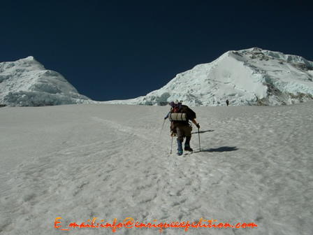Este día seguimos ascendiendo directamente en dirección al Escudo, que se observar según avancemos como una loma triangular de aproximadamente 450m. Una ves que nos encontremos en el lugar estaremos superándole, escaldando algunos tramos en hielo, después de pasar este obstáculo. Estaremos avanzando en travesía ascendente hacia la Garganta, bajo el cual en una zona protegida de avalanchas se instalara el C2 del Huascaran (6000m).