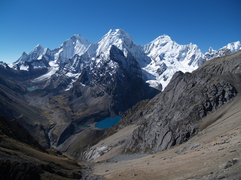 We will pass the third pass of Carnicero (4600m) and descend in between the lakes of Atocshaico, Carnicero. We will see the mountains Siula, Khural, Carnicero and Trapecio.
