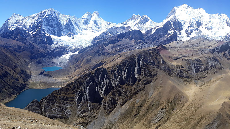 This day we will leave our camp to conquer two passes, Tapush (4900m) and Yaucha (4800m), to hike further towards lake Jahuacocha. From there we will enjoy a panoramic view of a part of the Cordillera Huayhuash, including Yerupaja, Hirishanca, Butcher, Siula, Trapeze etc. Arrival at our campsite at Lake Jahuacocha (4100m).