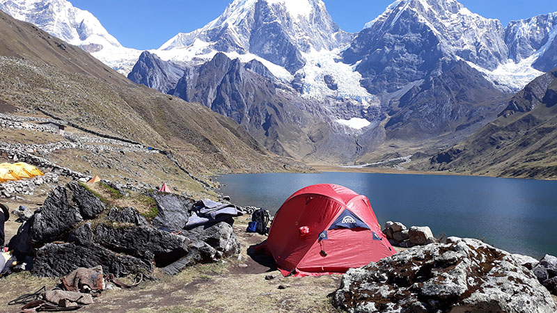 We will pass the first pass of Cacananpunta (4700m). We will observe some mountains like Ninashanca, Rondoy, the lakes of Pucacocha, Yanacocha Chico and Grande (small and big). Later by descending towards lake Mitococha we will get to see the mountains Rondoy and Hirishanca. We will continue our trekking and pass the second pass of Punta Carhuac (4650m) and descend through the ravine to our camp Carhuacocha. We will enjoy a panoramic view of the mountains Jirishanca, Yerupaja, Toro, etc.