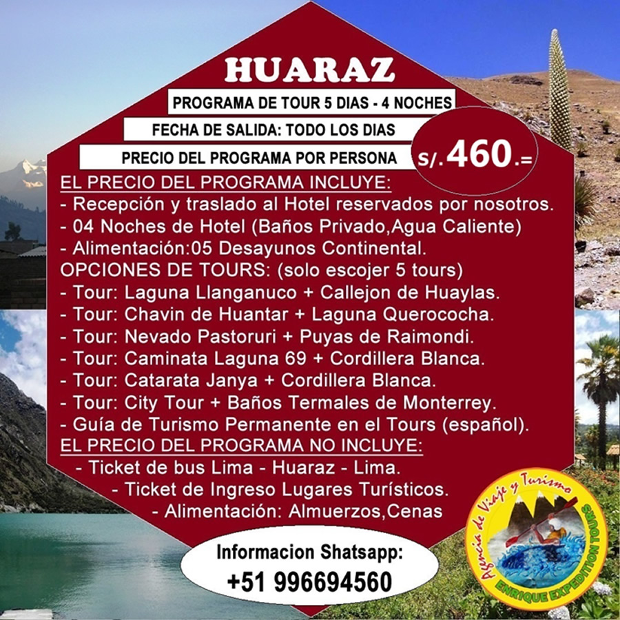TURISMO ECONOMICO SIN TICKET DE BUS HUARAZ 5 DIAS 4 NOCHES. |