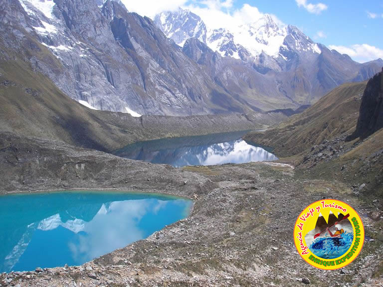 Se pasa el tercer paso de Carnicero (4600). Descenso por en medio de las Lagunas de Atocshaico, Carnicero. Observamos los nevados Siula, Jural, Carnicero y Trapecio.