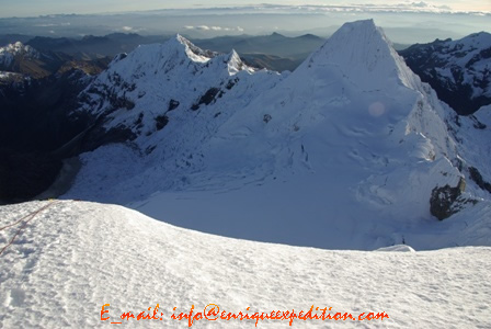 Iniciaremos la ascensión a las 3:00am para estar en la madrugada escalando la pared N, se asciende en 5 horas y se desciende en 3 horas hasta el Campo 1, estaremos saliendo del C1 para descender ligeramente por franco glacial hasta llegar a una loma rocosa que se encuentra al medio de la pared. La ruta asciende a la derecha de una loma rocosa por uniformes pendientes de 45-50º hasta alcanzar la Arista O, que se encuentra a 100m de la cumbre. Después de obtener la cumbre estaremos retornando hasta el campo base, Nuestros porteadores trasportaron todo el equipaje desde el C1 de retorno hasta el Cb Alpamayo (horas aprox. 10 – 12 h). Campamento.