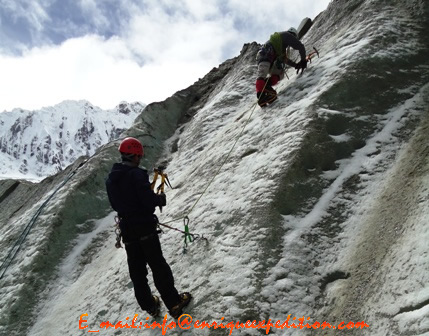 Saldremos de Huaráz en movilidad privada hasta el campo base del nevado Vallunaraju que se encuentra en la quebrada Llaca, organización de nuestro campamento a un costado del refugio de la Casa de Guías estando en este lugar podemos nosotros realizar algunas prácticas de escalada en Roca y Hielo debido a que hay paredes equipadas para hacer estas actividades.