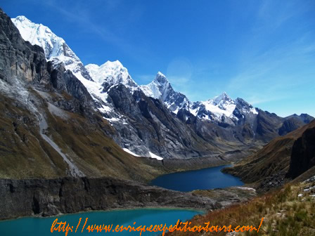 Caminata de 6 – 7 Horas. Se pasa el tercer paso de Carnicero (4600). Descenso por en medio de las Lagunas de Atocshaico, Carnicero. Observamos los nevados Siula, Jural, Carnicero y Trapecio.