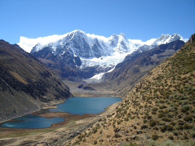 Se pasa el tercer paso de Carnicero (4600). Descenso por en medio de las Lagunas de Atocshaico, Carnicero. Observamos los nevados Siula, Jural, Carnicero y Trapecio.