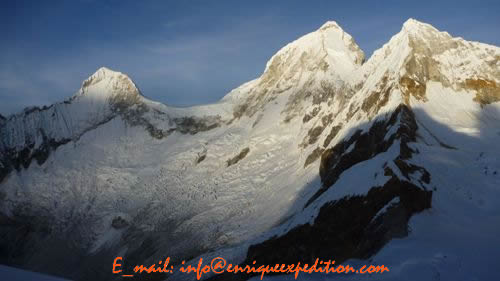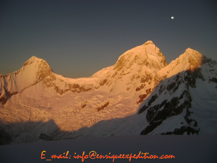 Salimos muy temprano del Cb, subimos una morrena encima de la laguna Lejiacocha y nos dirigimos hacia el C1 (5200) para llegar al C1 hay que pasar una zona pedregosa de unos 400 metros encima de la cual está el C1, en esta parte el equipaje lo llevaremos con porteadores ya que el acceso de mulas es imposible y si hay nieve en esta parte utilizar grampones y piolet en esta zona nos dirigiremos más a la parte izquierda posible y también es conveniente pasar muy temprano ya que caen muchas piedras, por lo tanto le proporcionaremos cascos, la pendiente de hasta 50 -55º. Si es un año seco la nieve empieza a mitad del corredor donde se entra al glacial. Desde este punto al C1 ir Subiendo una interminable cuesta de 40 – 45º porteando nuestras equipaje y también sorteando alguna grietas estaremos llegando al C1 a 5200m estaremos apreciando una vista espectacular del gran plato glacial que tiene este nevado.