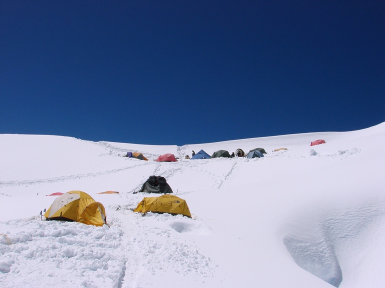 Este día nuestros porteadores se encargaron en trasportar nuestros equipo técnico de escalada, Alimento y campamento y salimos para comenzar a ascender la morrena, en el trayecto nos encontremos con lugares muy rocoso y estas trochas acompañadas de pulidas rocas granito y tras superarlos lleguemos a ingresar al glacial, ingresaremos por la fácil rampas, después de bordear algunas grietas nos situaremos debajo del ya conocido collado, y comenzar a escalar poco a poco hasta llegar a las pendientes finales ( 60º - 65º) y superemos este collado para estar descendiendo unos metros mas y ubicarnos en el C1 del Alpamayo. (Campamento 1 - 5300 m.s.n.m).