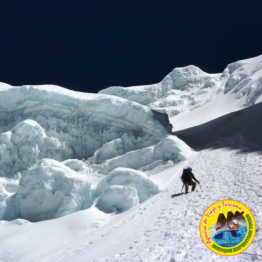 Salimos muy temprano del Cb, subimos una morrena encima de la laguna Lejiacocha y nos dirigimos hacia el C1 (5200) para llegar al C1 hay que pasar una zona pedregosa de unos 400 metros encima de la cual está el C1, en esta parte el equipaje lo llevaremos con porteadores ya que el acceso de mulas es imposible y si hay nieve en esta parte utilizar grampones y piolet en esta zona nos dirigiremos más a la parte izquierda posible y también es conveniente pasar muy temprano ya que caen muchas piedras, por lo tanto le proporcionaremos cascos, la pendiente de hasta 50 -55º. Si es un año seco la nieve empieza a mitad del corredor donde se entra al glacial. Desde este punto al C1 ir Subiendo una interminable cuesta de 40 – 45º porteando nuestras equipaje y también sorteando alguna grietas estaremos llegando al C1 a 5200m estaremos apreciando una vista espectacular del gran plato glacial que tiene este nevado.