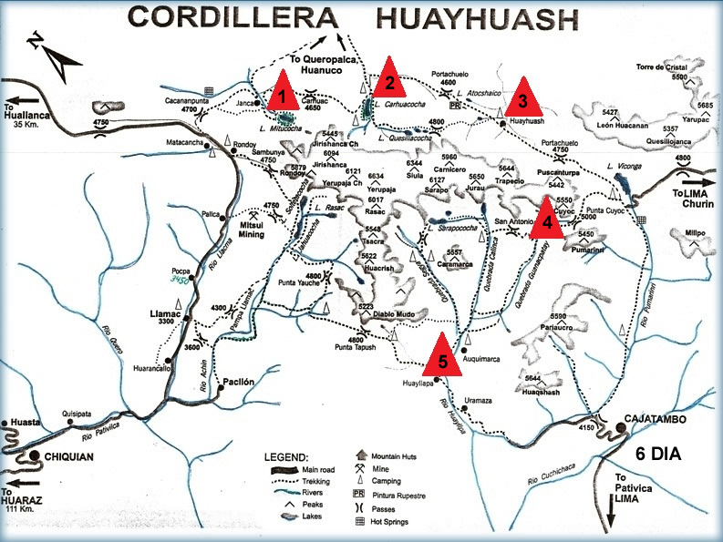 MAPA DE LA RUTA DE TREKKING CORDILLERA HUAYHUASH 6 DIAS. |