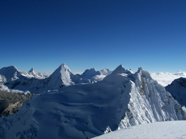 Saldremos de campamento aprox. 3:00am. Y escalaremos corredores (65 – 70º) que nos llevara a la parte alta de la Garganta (6010m) y de este punto estaremos subiendo largas lomas, y evitaremos grandes grietas hasta llegar a alcanzar la cumbre cimera del Huascarán (6768). Jornada de aprox. 12 horas,